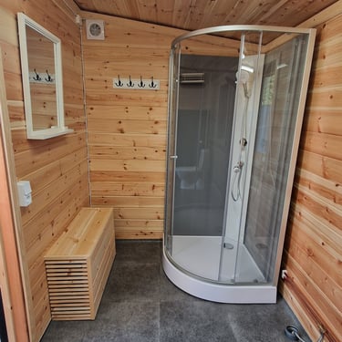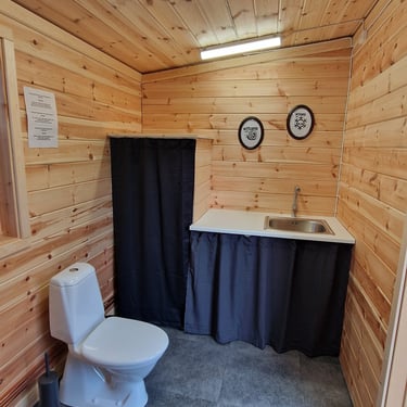 Die modernen Sanitäranlagen (WC, Dusche & Waschbecken) findet ihr direkt nebenan im neuen beheizten "Bathroom".