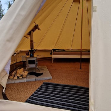 Unser geräumiges Canvas-Zelt bietet dir ein gemütliches Outdoor-Erlebnis mit einem Hauch Komfort. Ausgestattet mit einem Winnerwell Zeltofen für wohlige Wärme – auch an kühleren Tagen – und zwei 80x200 cm Betten mit bequemen Matratzen, Kissen und Duvets, musst du auf erholsamen Schlaf nicht verzichten.